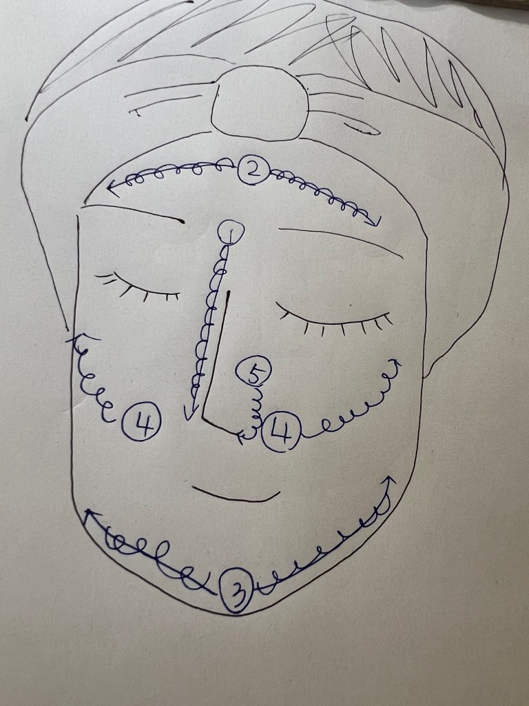 1番→鼻筋 2→おでこ 3→顎先から外側のフェイスライン 4→頬(内側から外側) 5→小鼻